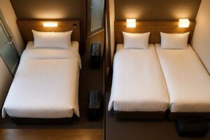 スタンダード系は1ベッド前提(ダブル相当)での販売が中心ですが、睡眠の独立性や荷物量を重視するならツイン(2台)を検討すると余裕が生まれます。