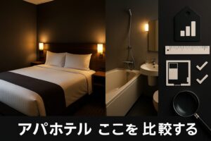 選び方で迷ったら、まず客室の広さ(㎡)ベッド幅(cm)風呂の仕様を同じ土俵で比べます。