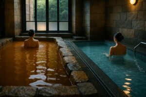 一方、銀の湯では、無色透明の「銀泉」(炭酸泉+ラジウム泉)を楽しめます。さらっとしたお湯で、公式情報では「炭酸泉・ラジウム泉を利用した銀泉」と説明されています。スチームサウナもあり、「寺町界隈の落ち着いた雰囲気に合わせた和風のたたずまい」の建物で、静かにくつろぎたい方に人気です。