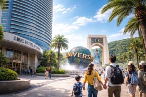楽天トラベルの施設情報では、リーベルホテル大阪からテーマパークまで徒歩約13分が目安と案内されています。