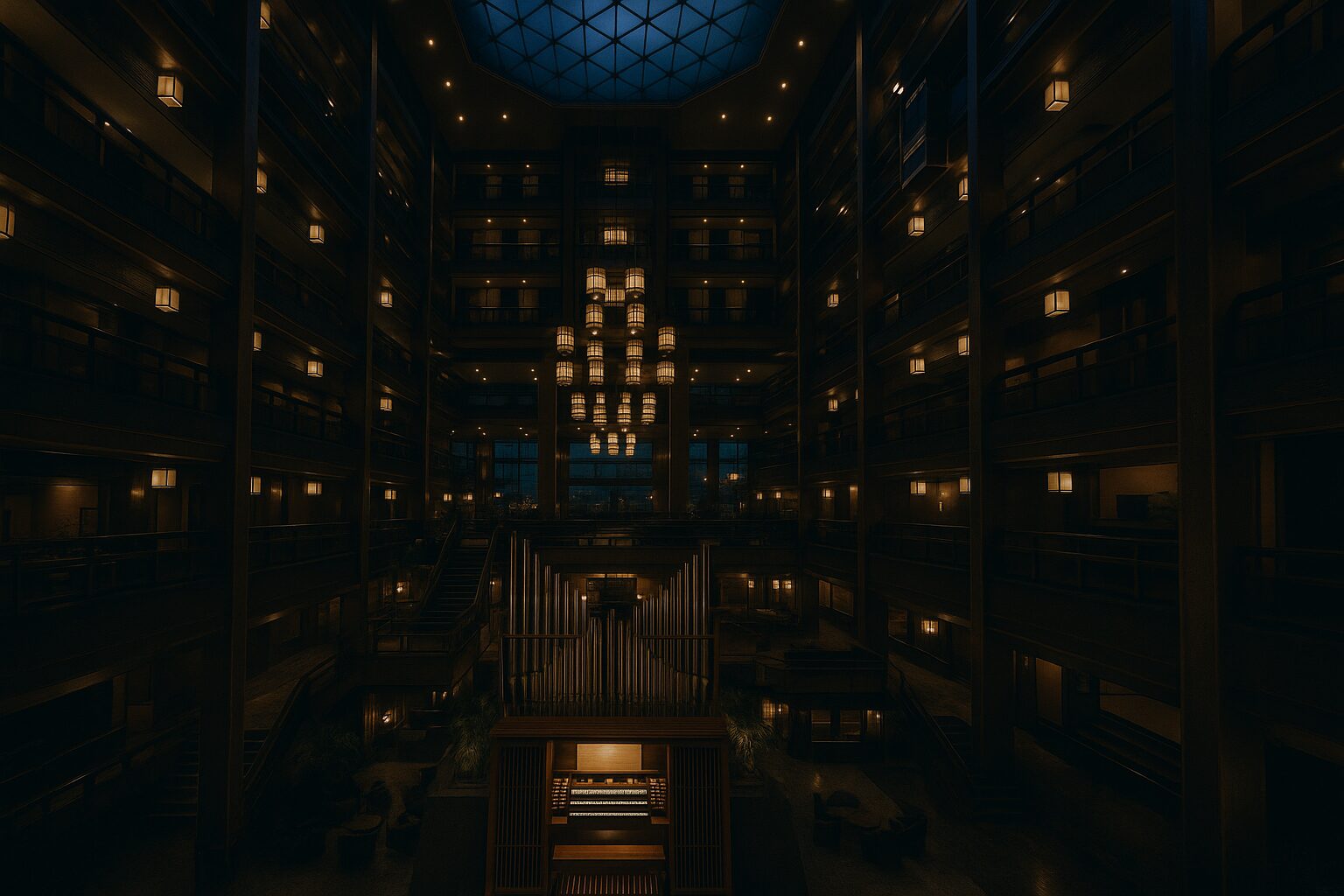 - ロビー中央が何層にも吹き抜けになった構造で、上を見上げると圧倒される