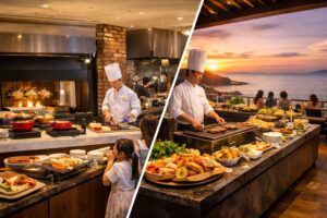 いっぽう、シーダパレスやSORAは朝食(7:00〜10:00)も用意されていて、同じ会場で夕・朝を食べる想定のプランも多いです。希望で朝食だけ替える場合は、追加料金や入場枠の都合で難しいことがあるので、予約前後に確認すると安心です。