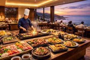 SORAはラグジュアリーなビュッフェで、ライブスタイルのオープンキッチンがあり、別府の景色を楽しめるテラス席も用意されています。会話を大切にしたいカップルに向きます(利用は宙館宿泊者のみ)。