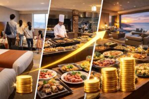 さらに、宿泊プランによってレストラン会場が変わる場合があるため、当日ふらっと別会場へ…は難しいことがあります。変更すると夕食の入場枠(ご利用時間の目安100分など)にも関わるので、調整が必要になることも。