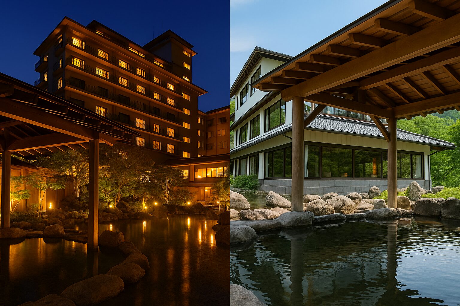 | 温泉と食事はどこまで共通? | 温泉は共通で楽しめる範囲が広い/食事はプラン条件次第 |